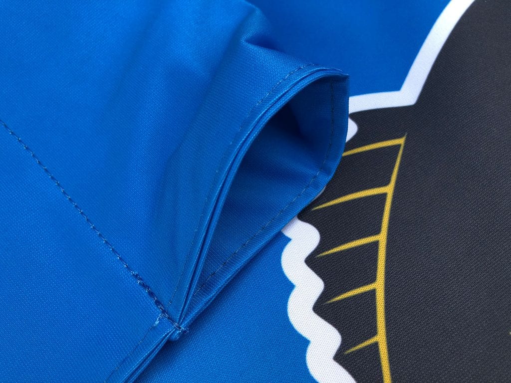 That’s the basic process of how we manufacture your banners pole pockets and the reason why we require a safe area. We use the same method when producing double-sided or single-sided banners. Because banners are large-format items, you will never full align text and logos up on the opposite side. To seamlessly join a banner to mm precision would be unachievable as we work with tolerances of around 5mm. Meaning that if we flip the side over which features text and logos, then the artwork won’t match. However, with background and solid colours, there is more tolerance due to the nature of the image etc.