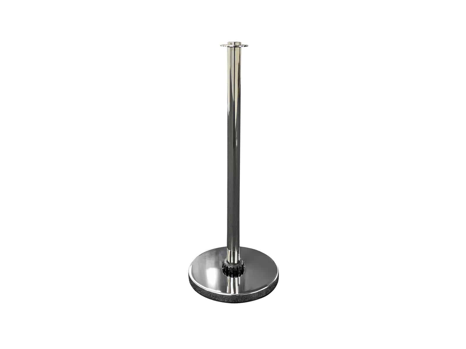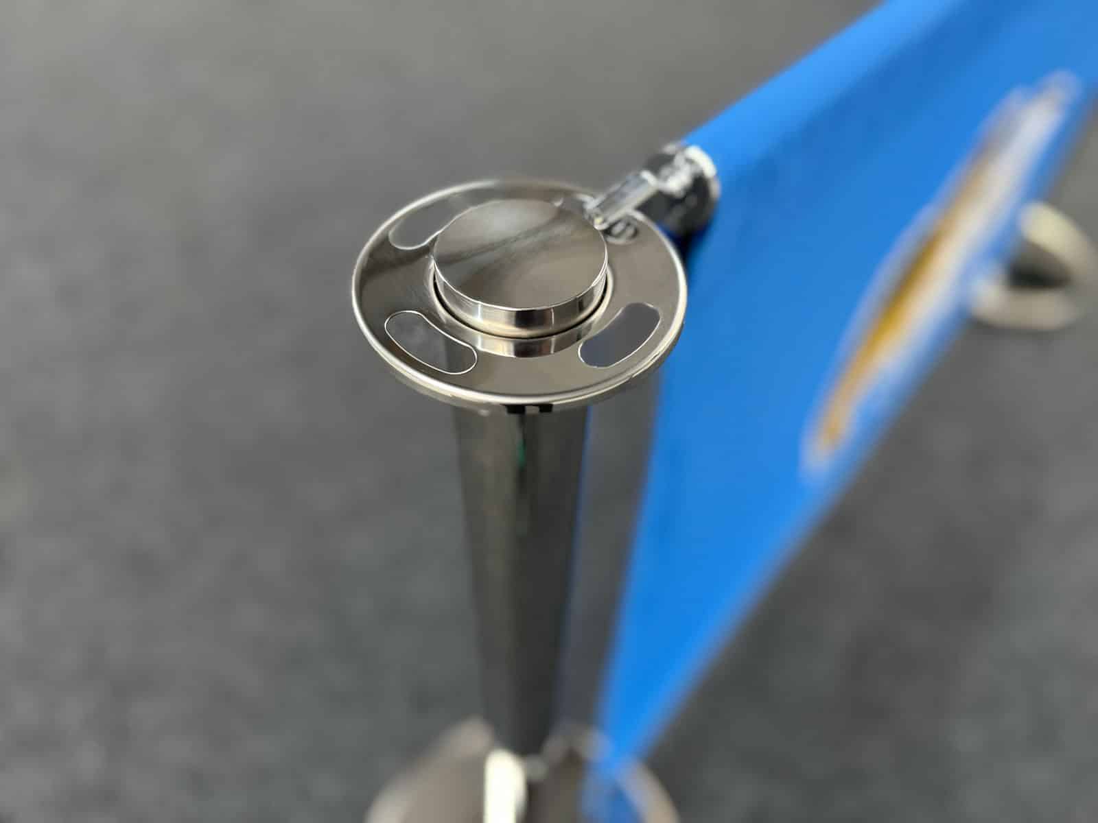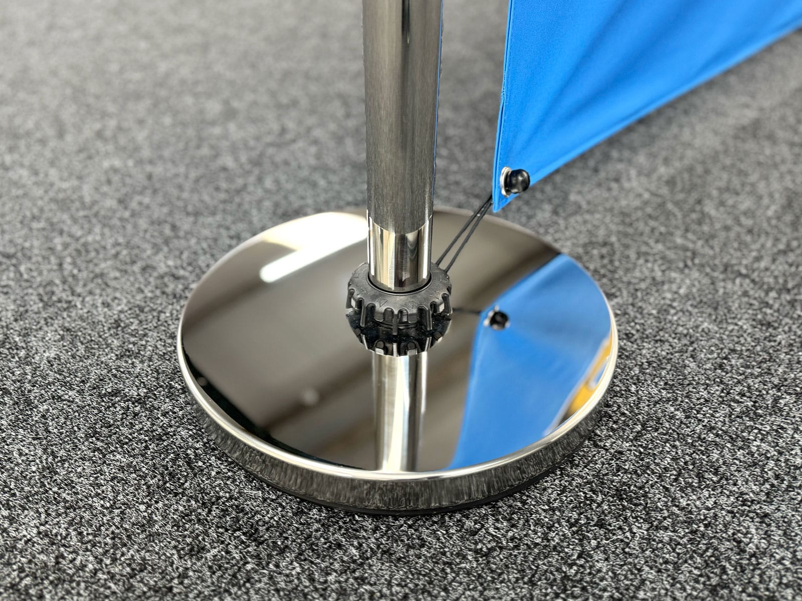 The Budget Post and Base is a polished stainless steel post and base plate, weighing in at 10.5kg. The system is configured with a Crossrail top and Spring Clips bottom to secure and tension the banner.