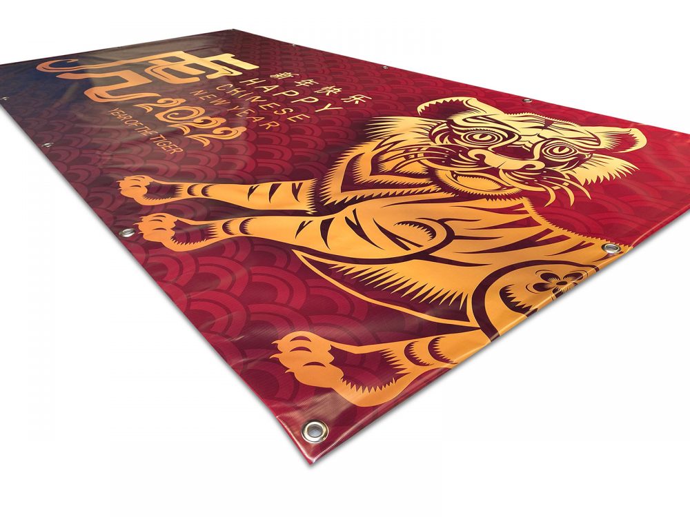Our PVC banner material is weather and flame resistant. We finish your banners to your specific requirements. We can make your banners with hem and eyelets, pole pockets or customised finishing. We print these banners at up to 2.5m in ONE dimension. Our Chinese New Year banners are a cost-effective solution — ideal for short to mid-term external use. For example, your banner could be 2.5m wide x any height, or 2.5m high x any width.