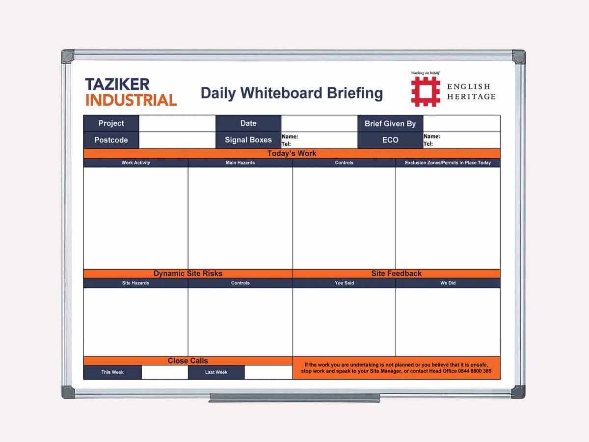 900mm x 600mm Custom Printed Dry Wipe Magnetic Whiteboard. We produce thousands of custom whiteboards each year to the trade. These are used for planning, production, training, sales performance tracking, health and safety stats, staff information and much more.