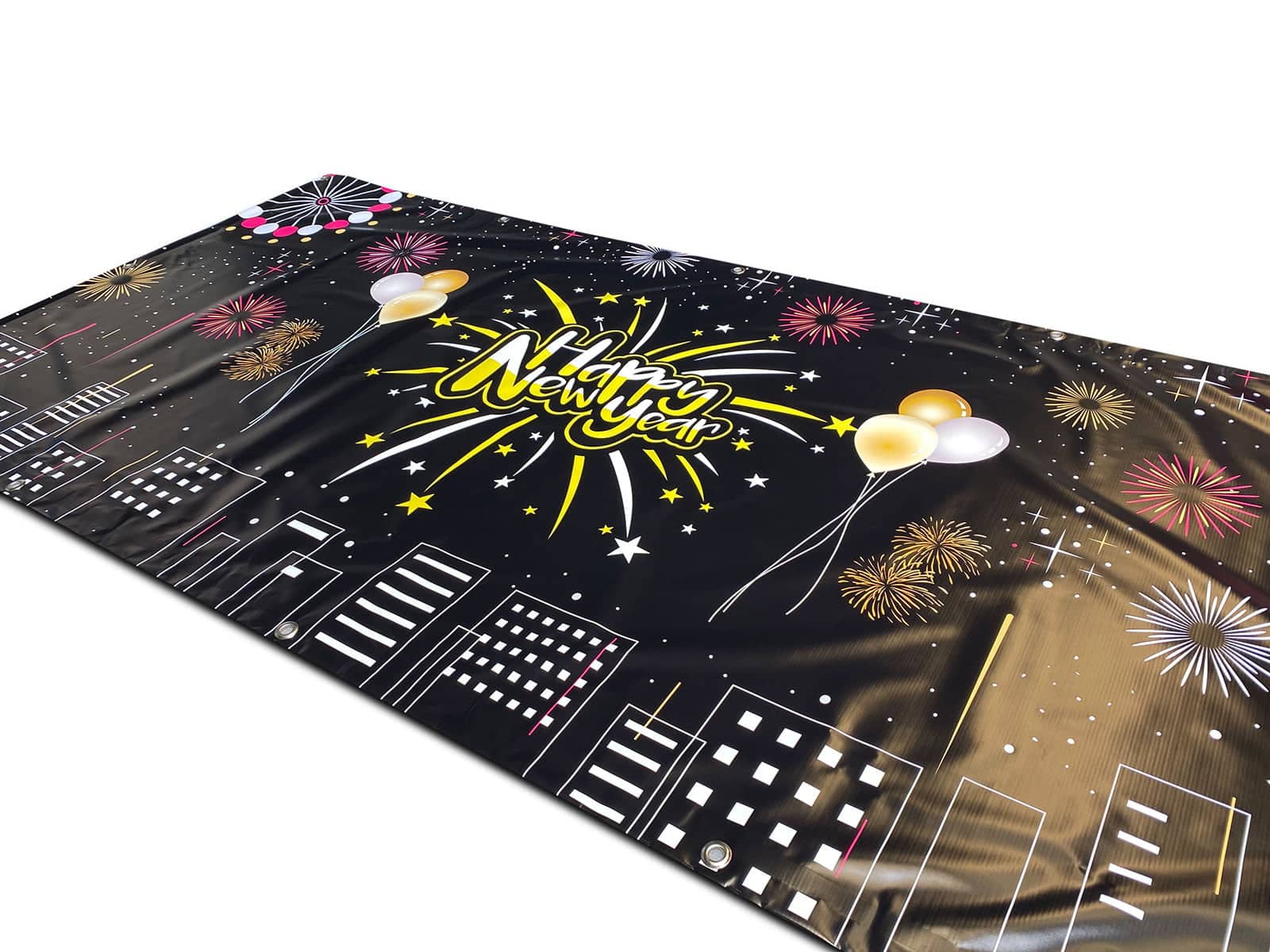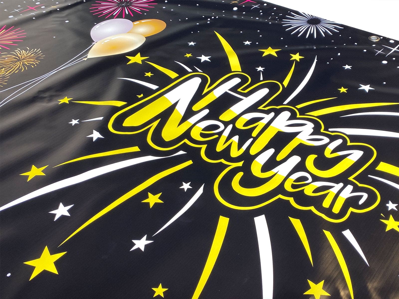 Happy New Year Banners are printed using high-quality UV print technology. This print process allows us to quickly make high-quality banners that will stand up to the elements.