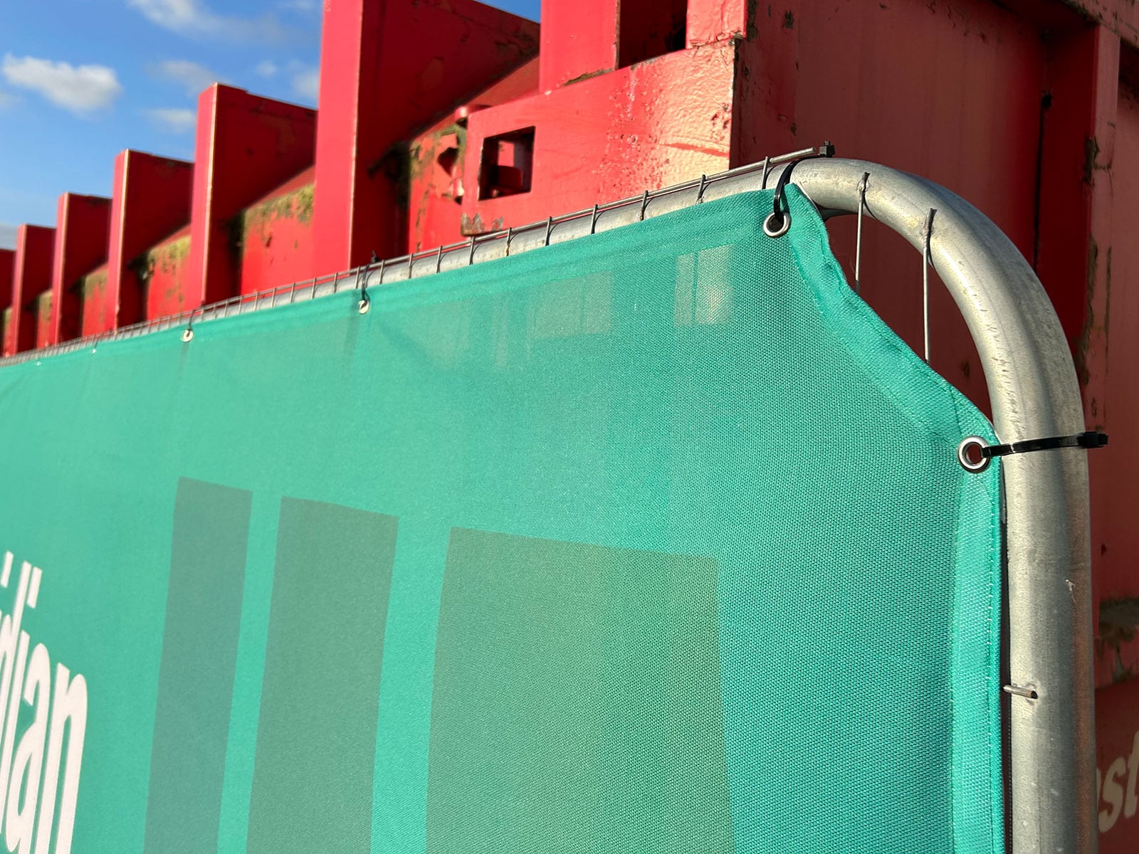 Heras fence banners are finished with hems and eyelets. Fitting is best done using plastic cable ties.