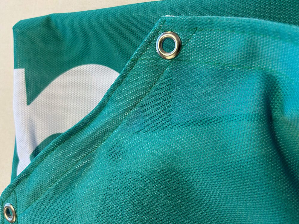 We use galvanised steel eyelets on our Mesh PVC.